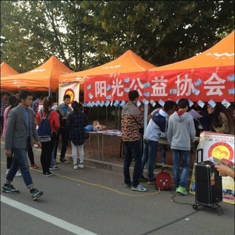 在眾多的社團之中,陽光公益協會估計是少數幾個我能看到的到場工作人員最多的了。遠遠地就能看見許多的學長學姐在賣力宣傳,帳篷上除了寫有“陽光公益協會”幾個大字的橫幅之外,還掛滿了舉辦過的各種活動的照片,包括“掛樹牌”、“我和社會主義核心價值觀有個合影”,有圖有真相,讓人頓生信賴??v觀整體布局,傳單制作精簡而不失精致,人員繁多卻不失秩序,帳篷裝飾簡潔卻又不失亮點??匆粋€人或者社團有沒有誠意,就要看它前期在人力物力上的投入,而在陽光公益協會,看到的是滿滿的誠意。