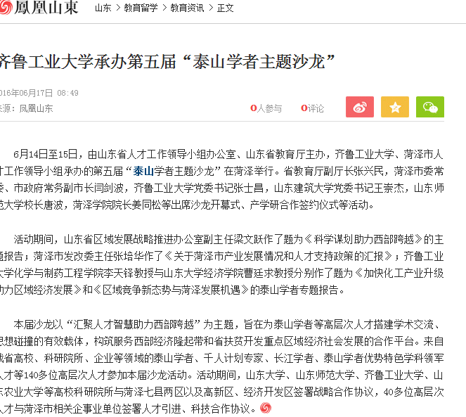 【鳳凰網】齊魯工業大學承辦第五屆“泰山學者主題沙龍”