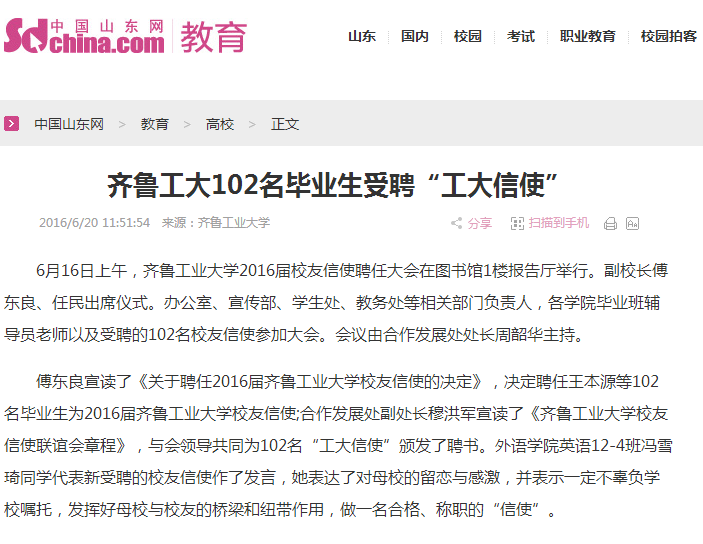 【中國山東網】齊魯工大102名畢業生受聘“工大信使”
