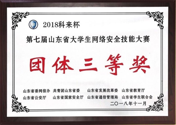 11月4日,第七屆山東省大學生網絡安全技能大賽決賽暨頒獎儀式在淄博舉行。我校團委推薦的學生團隊在決賽中榮獲團體三等獎。該學生團隊由計算機科學與技術專業、網絡空間安全專業等專業學生組成,這是2018級網絡空間安全專業學生首次參加省級比賽并獲獎。