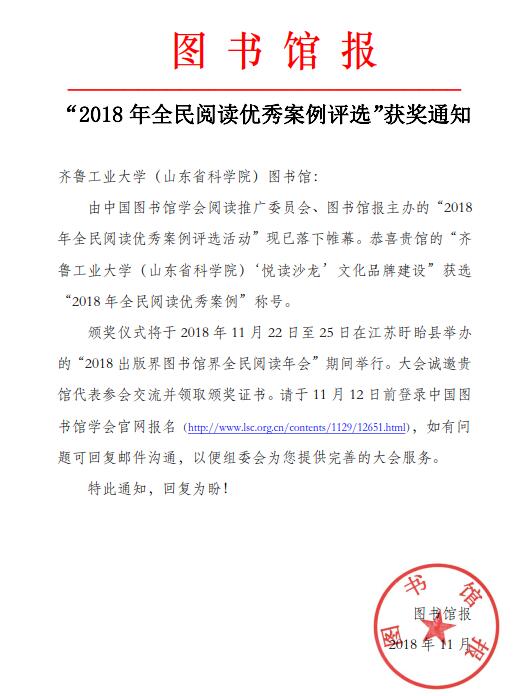 日前,2018年全民閱讀優秀案例評選結果揭曉,齊魯工業大學(省科學院)“悅讀沙龍”校園文化品牌建設項目喜獲“2018 年全民閱讀優秀案例”稱號。