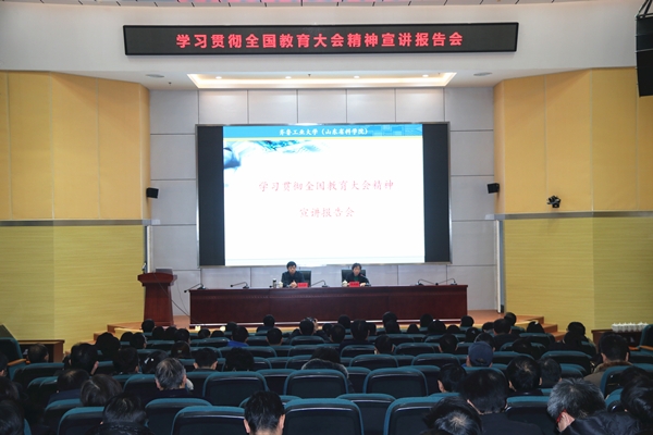 為深入學習宣傳貫徹全國教育大會精神,切實把全校教職員工的思想和行動統一到大會精神上來,12月13日下午,學校(科學院)在長清校區辦公樓報告廳召開學習貫徹全國教育大會精神宣講報告會。報告會由黨委副書記張洪英主持。山東宣講團成員、學報編輯部主任馬萬勇作主題宣講報告。各學院副處級以上干部、系(教研室)主任、團委書記,教務處、研究生處、學生處、校團委全體人員及部分師生代表近300人聆聽了報告。