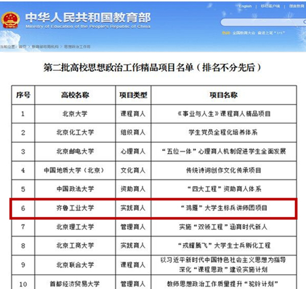 教育部開展高校思想政治工作精品項目遴選培育,旨在深入學習貫徹習近平新時代中國特色社會主義思想和黨的十九大精神,全面貫徹落實全國高校思想政治工作會議精神,著力促進高校思想政治工作質量提升工程深入實施。重點培育和支持一批在全國高校具有可示范、可引領、可輻射、可推廣、可持續意義的精品工作項目,引領新時代高校思想政治工作實現系統設計、分步實施、重點突破、全面提升。經學校(科學院)黨委審核,山東省委教育工委初選推薦,教育部思想政治工作司組織專家遴選和公示等環節,我校申報的《“鴻雁”大學生標兵講師團》從近千個候選項目中脫穎而出、光榮入選。