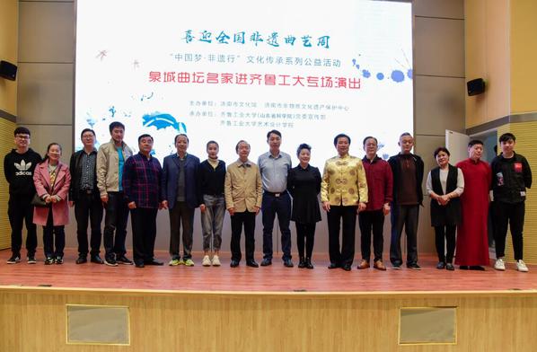 本次“中國夢?非遺行”曲藝進校園活動是由濟南市文化館、濟南市非物質文化遺產保護中心發起和組織的,演出隊伍由濟南市市級以上曲藝項目傳承人及優秀青年曲藝演員組成?;顒佑牲h委宣傳部、藝術設計學院主辦。旨在讓師生們充分感受中國曲藝獨特的藝術魅力和強大的文化力量,豐富學校思政工作載體,引導學生自覺樹立文化自信,激發民族自豪感,為提升學生的綜合素質起到積極的推動作用。