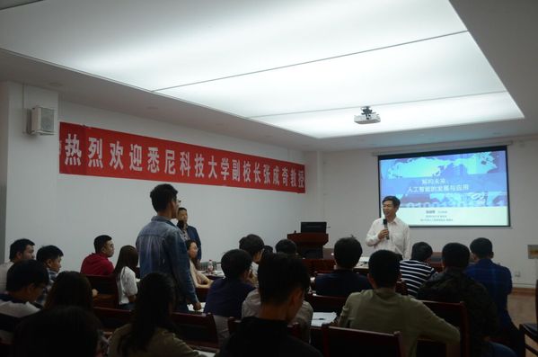 隨后,張成奇教授在計算機學院會議室A407為師生帶來了題為“解構未來:人工智能發展與應用”的學術前沿報告。張教授從人工智能(AI)興起講起,通過解析著名的圖靈測試闡釋AI的本質;通過回顧AI的三大學派,解釋其與人類三種智能(知識、感知、行為)之間的關系;通過梳理AI發展過程中幾大關鍵分支領域,如專家系統、分布式專家系統、多智能體協助、數據挖掘等,總結出當前AI獲得空前爆發式發展主要歸功于不同場景下大數據、云計算、深度學習的興起。張教授以深入淺出的語言,淺顯易懂的講解,讓在場師生從更高層面對人工智能的簡史、現狀與未來發展有了更深入的理解。