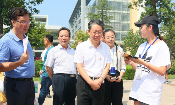 上午10時許,校(院)領導王英龍、陳嘉川、劉永波、周有波、馬文才、任民、房克樂、曹茂永在相關部門負責人陪同下來到迎新現場看望新生及家長,慰問工作人員和學生志愿者。校(院)領導每到一處,都詳細詢問新生報到情況,囑咐在場工作人員和學生志愿者熱情周到服務,讓每一位前來報到的新生和家長都能感受到家的溫暖。在綠色通道區域,校(院)領導看望了經濟困難學生,關懷并勉勵他們刻苦學習,立志成才,同時要求廣大工作人員再接再厲,認真做好入學教育工作,引導廣大新生扣好人生“第一??圩印?,不辜負家長和社會重托。