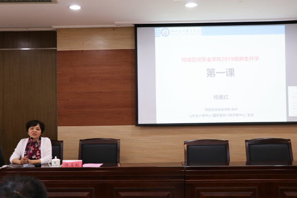 院長楊美紅為全體新生上“大學第一課”。她首先介紹了學院的概況和下一步發展規劃,指出網絡安全學科一定會有長足的發展和美好的未來。隨后她分別從德、能、勤、績四個方面論述了網安學子應有的素養。她表示,只要做好規劃,勤奮努力,付諸實踐,網安學子都能成為適應社會發展的優秀人才。