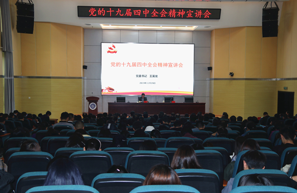 劉永波在主持報告會時指出,要切實把學習、宣傳和貫徹黨的十九屆四中全會精神引向深入。一是把思想和行動統一到全會精神上來。把學習貫徹全會精神與“不忘初心、牢記使命”主題教育緊密結合起來,加強領導,細化方案,扎實推進。二是把學習宣傳貫徹工作引向深入。校(院)宣講團成員要認真開展集中宣講工作,確保教職工全覆蓋、確保學生群體全覆蓋,推動全會精神入腦入心。三是結合實際,抓好黨委決策部署的落實。各部門單位要把學習宣傳貫徹黨的十九屆四中全會精神同具體工作結合起來,與推進“八大行動計劃”結合起來,與“四個示范”要求結合起來,把貫徹落實的舉措轉化為校(院)發展的生動實踐。
