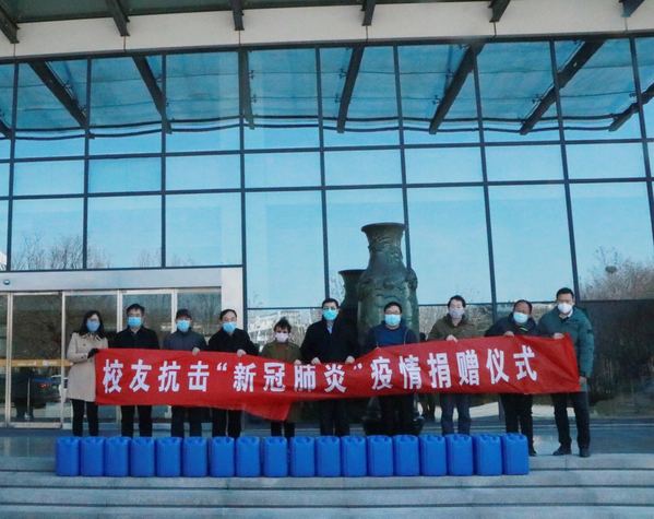 2月18日上午,2010級環境科學專業校友、菏澤校友分會秘書長、鄆城縣林春毛制品有限公司總經理白鐘琪代表菏澤校友分會向學校(科學院)捐贈疫情防控應急物資84消毒液5噸,助力母校疫情防控工作。校(院)黨委副書記、疫情防控工作領導小組副組長張洪英,副校(院)長、疫情防控工作領導小組辦公室主任周有波出席捐贈儀式,學生工作(部)處、服務地方經濟辦公室(校友辦)、環境科學與工程學院以及校(院)疫情防控領導小組相關成員參加了儀式。