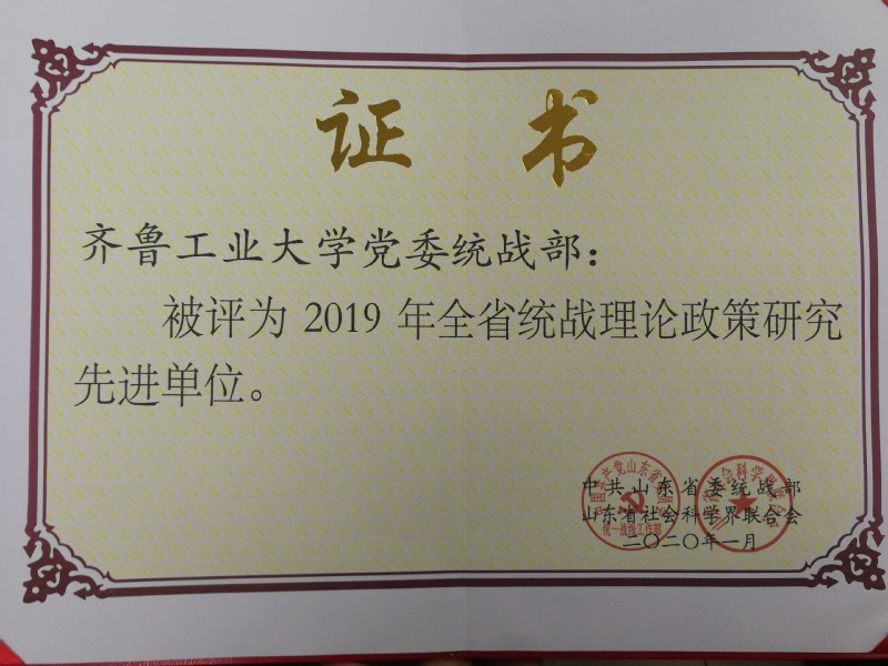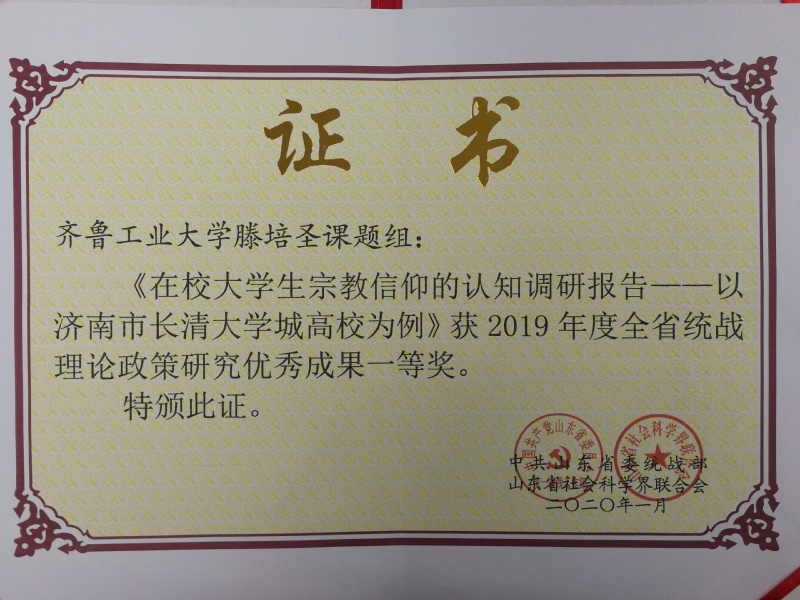 由中共山東省委統戰部、山東省社會科學界聯合會組織開展的2019年度全省統戰調研宣傳工作優秀成果和先進單位評選活動中,齊魯工業大學(山東省科學院)黨委統戰部被評為“全省統戰理論政策研究先進單位”;滕培勝課題組撰寫的《在校大學生宗教信仰的認知調研報告——以濟南市長清大學城高校為例》榮獲全省統戰理論政策研究成果一等獎。