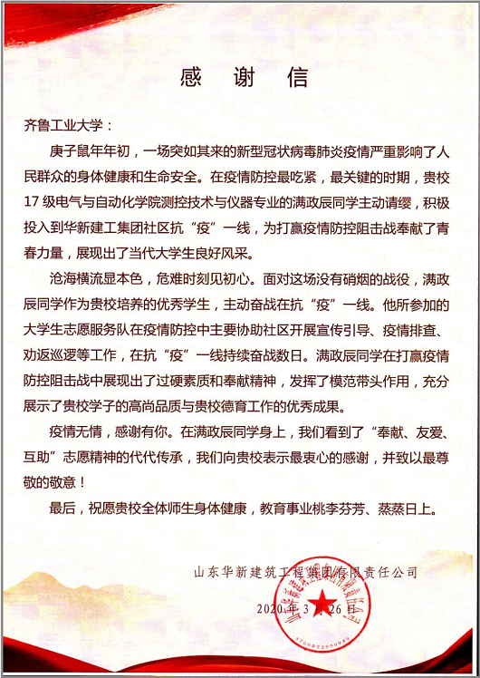 “工”同戰“疫”,必定有我。近日,齊魯工業大學(山東省科學院)再次收到感謝信,山東華新建筑工程集團有限公司對電氣與自動化學院滿政辰同學主動請纓,積極投入到華新建工集團社區抗“疫”一線,踴躍參與防疫工作表達感謝。