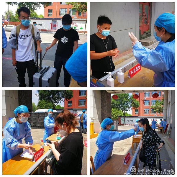 學生到達校門口后,早已做好準備的老師們有條不紊的進行著酒精消毒、信息登記、檢測體溫等工作。為保障返校師生安全,老師們每一步都嚴謹認真,同學們也十分配合各項工作。