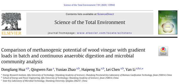 近日,山東省科學院能源研究所2018級碩士研究生范慶文在環境領域國際知名期刊《Science of the Total Environment》(中科院一區TOP,IF=5.59)發表題為“Comparison ofmethanogenic potential of wood vinegar with gradient loads in batch andcontinuous anaerobic digestion and microbial community analysis”的最新研究成果,齊魯工業大學(山東省科學院)為第一完成單位,指導教師為第一作者。這是該同學5月份在《Journal of Cleaner Production》(中科院一區TOP,IF=6.40)發表論文后再次發表高水平學術論文。