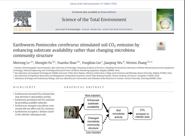 近日,山東省科學院海洋儀器儀表研究所呂美蓉博士等撰寫的論文“Earthworm Pontoscolex corethrurus stimulated soil CO2 emission by enhancing substrate availability rather than changing microbiota community structure”被環境科學領域期刊《Science of the Total Environment》錄用發表。根據2020年最新升級版中科院分區,該期刊為一區,影響因子6.551。