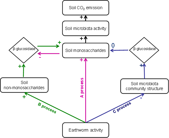 該篇論文聚焦蚯蚓調控CO2排放的作用機理,通過交叉接種實驗區分了蚯蚓的上行效應(提高資源可利用性)和下行效應(改變微生物群落),發現蚯蚓活動雖然顯著改變了微生物群落結構,但這并不是蚯蚓影響CO2排放的主要原因;蚯蚓影響CO2排放主要通過提高碳的可利用性而非通過改變微生物群落結構。該論文揭示了蚯蚓調控有機質礦化過程的深層次機理,加深了對生物在碳循環中的作用的理解。