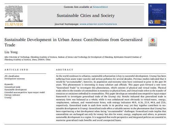 近日, 戰略所、情報所劉用博士學術論文《SustainableDevelopment in Urban Areas: Contributions from Generalized Trade》在SCI國際期刊《Sustainable Cities and Society》在線發表(最新影響因子:5.268;JEL 分類為發展經濟學)。