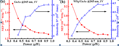 該工作基于傳統的GaAs半導體襯底構筑了WS2/GaAs異質結并成功制備了自驅動、高響應度光探測器,該探測器在內建電場作用下不需外加電壓即可驅動,在365 nm波段的響應度達到65.58 A/W,相較于GaAs探測器的30.04 A/W提高了一倍以上,同時在880 nm波段的響應度達到28.50 A/W。此外該探測器表現出優異的噪聲性能和光探測能力,其NEP(Noise Equivalent Power)達到1.97 × 10?15 W∕HzI∕2, Detectivity 達到4.47 × 1012 Jones。該項工作為進一步提高傳統探測器的性能提供了潛在的有效途徑。
