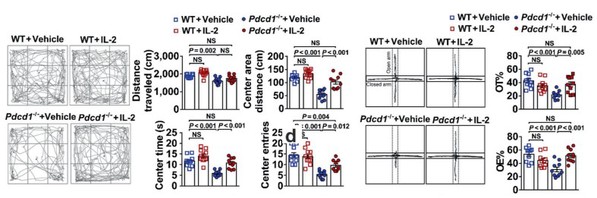 在自身免疫性疾病模型小鼠中,外周T細胞的過度反應可導致了腦內代謝的異常,大大降低單胺類神經遞質包括多巴胺(Dopamine)和5羥色胺(5-HT)的水平,引起焦慮樣行為的發生。低劑量IL-2治療是新興的一種調節免疫平衡的治療方法,其通過選擇性的擴增調節性T細胞來抑制效應T細胞引起的炎癥反應。假設低劑量IL-2治療可以改善由外周免疫反應失調引起的的焦慮癥狀。研究利用PD-1缺陷(Pdcd1-/-)小鼠,從行為學、代謝學和免疫學等方面進行了探討,證實了低劑量IL-2治療可以通過抑制外周過度活化的免疫反應,補償神經遞質合成所需的必需氨基酸的缺失,增加腦內單胺類神經遞質的水平,改善PD-1缺陷小鼠的焦慮樣行為。