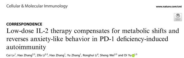 近日,齊魯工業大學藥學院、山東省分析測試中心呂翠博士,昆士蘭大學醫學院余迪教授和山東中醫藥大學魏盛教授開展合作研究,在Nature出版集團旗下的雜志《Cellular& Molecular Immunology》上在線發表了題為“Low-dose IL-2 therapy compensates for metabolicshifts and reverses anxiety-like behavior in PD-1 deficiency-induced autoimmunity”的論文。利用過度免疫激活模型小鼠—PD-1缺陷小鼠,該研究首次證實低劑量IL-2治療可以通過抑制外周過度活化的免疫反應,補償神經遞質合成所需的必需氨基酸的缺失,增加腦內單胺類神經遞質的水平,改善PD-1缺陷小鼠的焦慮樣行為。