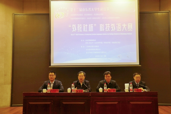 11月14日,由山東省科學技術協會、山東省教育廳、共青團山東省委、山東省發展和改革委員會、山東省經濟和信息化委員會、山東省人力資源和社會保障廳聯合主辦,山東省物聯網協會與齊魯工業大學(山東省科學院)承辦的第十二屆“外教社”杯山東省大學生科技外語大賽決賽于濟南市園博園酒店隆重舉行。學校(科學院)副校(院)長曹茂永、山東省物聯網協會副秘書長候廣堯出席開幕式。校(院)招生辦公室主任歐陽志周、外國語學院(國際教育學院)黨委書記陳國興參加活動。開幕式由陳國興主持。本次大賽邀請了山東大學、濟南大學、山東財經大學、曲阜師范大學、聊城大學、山東建筑大學、青島科技大學和齊魯工業大學(山東省科學院)8所學校的專家教授擔任評委。