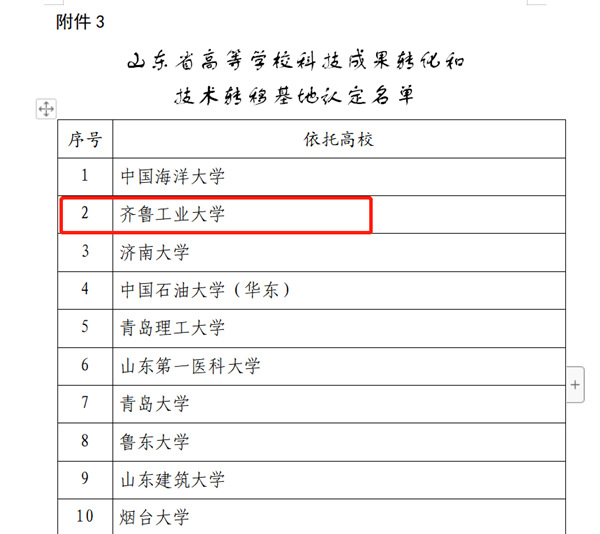 日前,省教育廳公布山東省高等學??萍汲晒D化與技術轉移基地認定名單(魯教科字〔2020〕6號)。齊魯工業大學(山東省科學院)被認定為山東省高等學??萍汲晒D化與技術轉移基地。