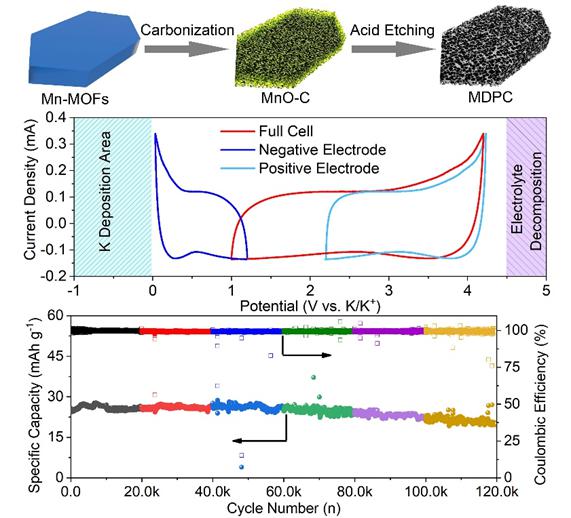 鉀離子電容器被認為是一種低成本、高容量的、可替代傳統鋰離子電容器的新型電容器,但是它的商業化應用受制于其較低的比能量和相對較短的循環壽命??l的論文研發了一種基于錳基金屬框架化合物衍生多孔炭陽極材料。該材料具有層間膨脹、無定型碳結構且表面富含氧官能團。結構和性能分析證實該材料具有良好儲鉀性能。以該炭材料作為鉀離子電容器的負極,多孔炭作為正極所組裝的鉀離子電容器能夠輸出120 Wh/kg的比能量,功率密度可達26 kW/kg,循環壽命達到10萬次以上,是目前報道的最高值。