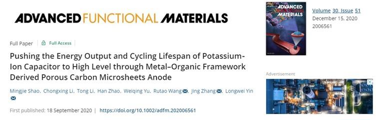 近日,山東省科學院新材料研究所氣凝膠材料創新團隊張晶副研究員與山東大學材料科學與工程學院王儒濤教授團隊合作,在國際頂級期刊《Advanced Functional Materials》上發表了題為“Pushing the Energy Output and Cycling Lifespan of Potassium-Ion Capacitor to High Level through Metal-Organic Framework Derived Porous Carbon Microsheets Anode”的最新研究成果。新材料所為共同通訊單位,張晶、王儒濤和山東大學尹龍衛教授為該論文的共同通訊作者。