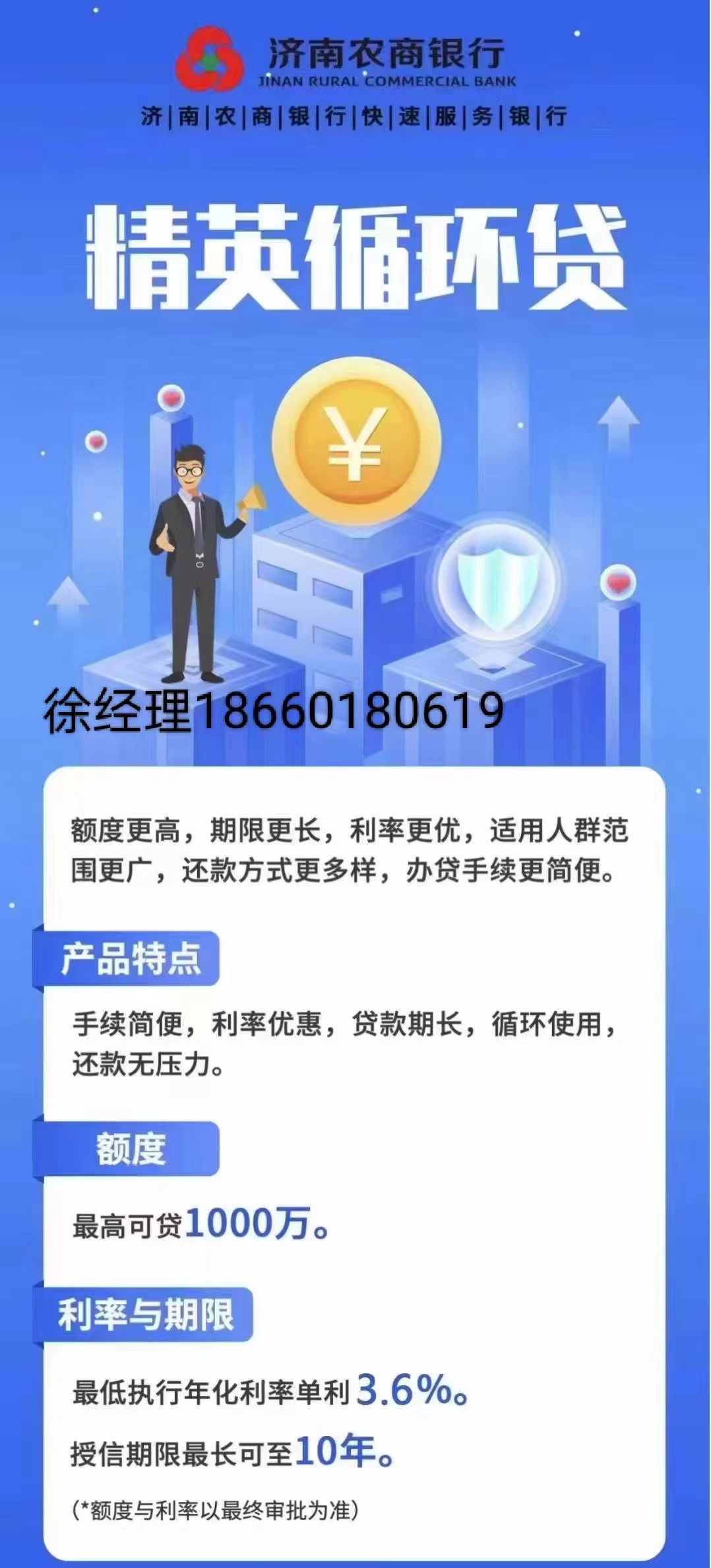 濟南農商銀行推出精英貸新政策,無抵押無擔保,純信用。額度最高200萬,年利率低至3.7%,社保繳納滿半年即可申請。期限5年,手機銀行自助放款,一次核定,循環使用,隨借隨還,不用不計息。