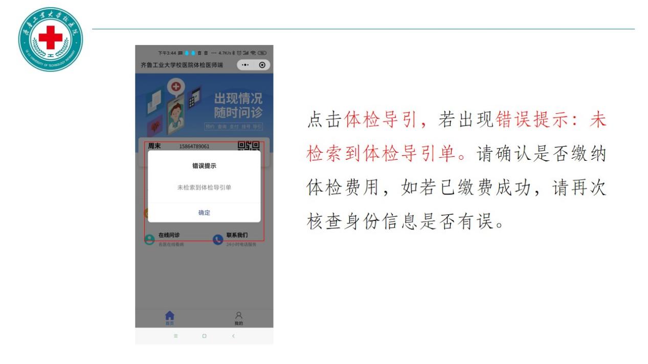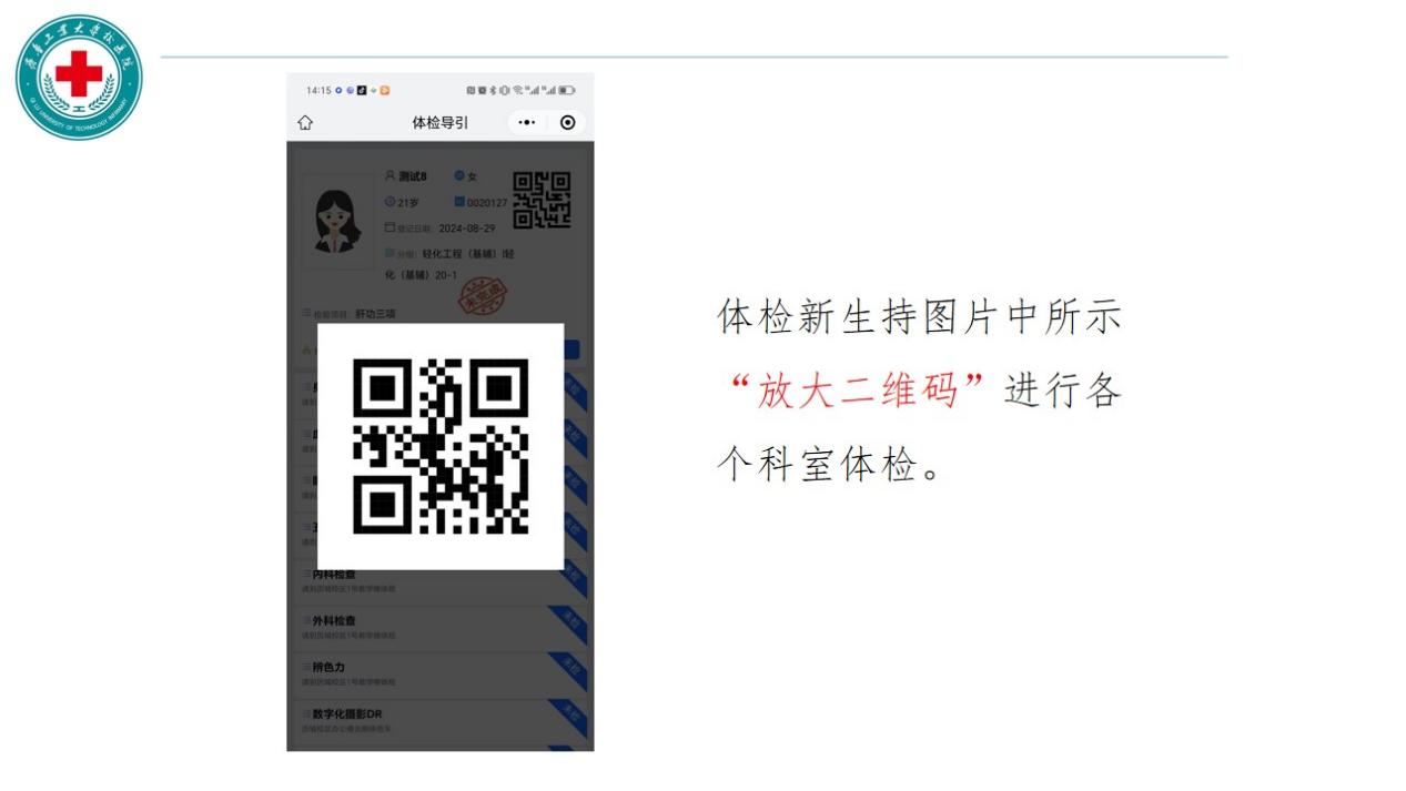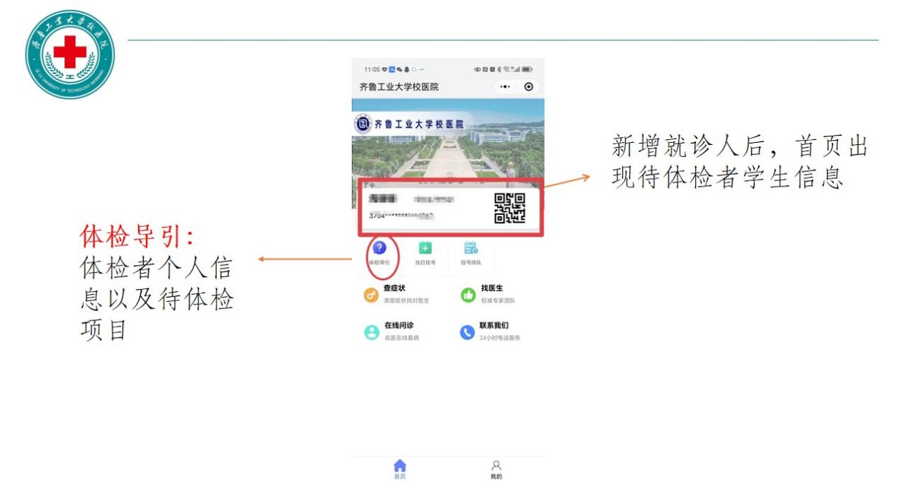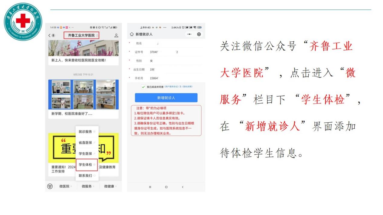 9.本年度尚未繳納體檢費的新生請及時繳納新生體檢費。部分需要額外檢查的項目:血常規、血糖、甲狀腺彩超、甲狀腺功能測定、肝膽彩超、心電圖、心臟彩超、動態心電圖、心肌酶、腎功等需另行開單交費檢查。請關注“齊魯工業大學醫院”微信公眾號,點擊“微服務”欄目下的“學生體檢”小程序生成體檢二維碼。常規體檢項目用體檢二維碼進行檢測。體檢時請攜帶智能手機和身份證。