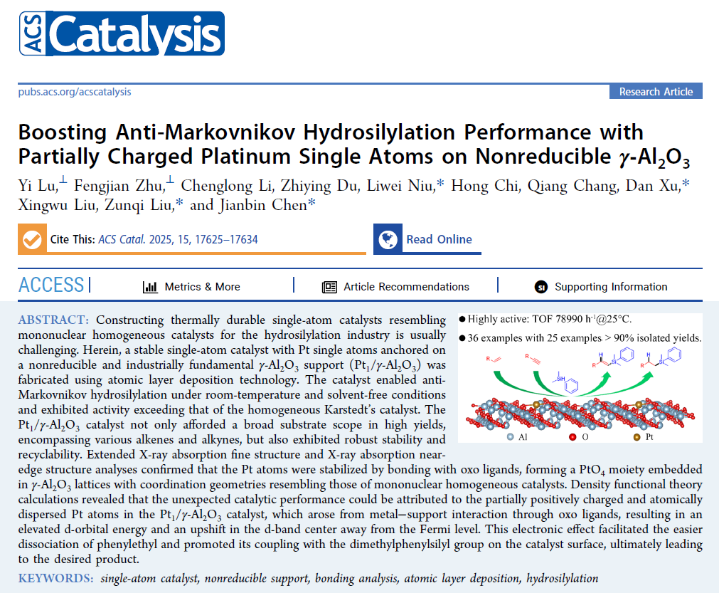 近日,化學與制藥學部牛立偉博士和陳建賓教授在催化領域國際頂級期刊《ACS Catalysis》(中科院一區TOP期刊,影響因子13.1)發表題為“Boosting Anti-Markovnikov Hydrosilylation Performance with Partially Charged Platinum Single Atoms on Nonreducible γ-Al2O3”的重要研究成果。他們成功設計出一種新型鉑單原子催化劑,可在室溫、無溶劑條件下高效實現反馬氏規則硅氫加成,為綠色有機硅工業提供了突破性技術方案。學部碩士生路翊和朱鳳健為共同第一作者,齊魯工業大學(山東省科學院)化學與制藥學部為第一通訊單位,山東省科學院能源研究所和新疆農業大學化學與化工學院為合作通訊單位。